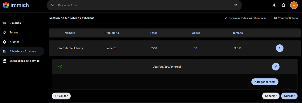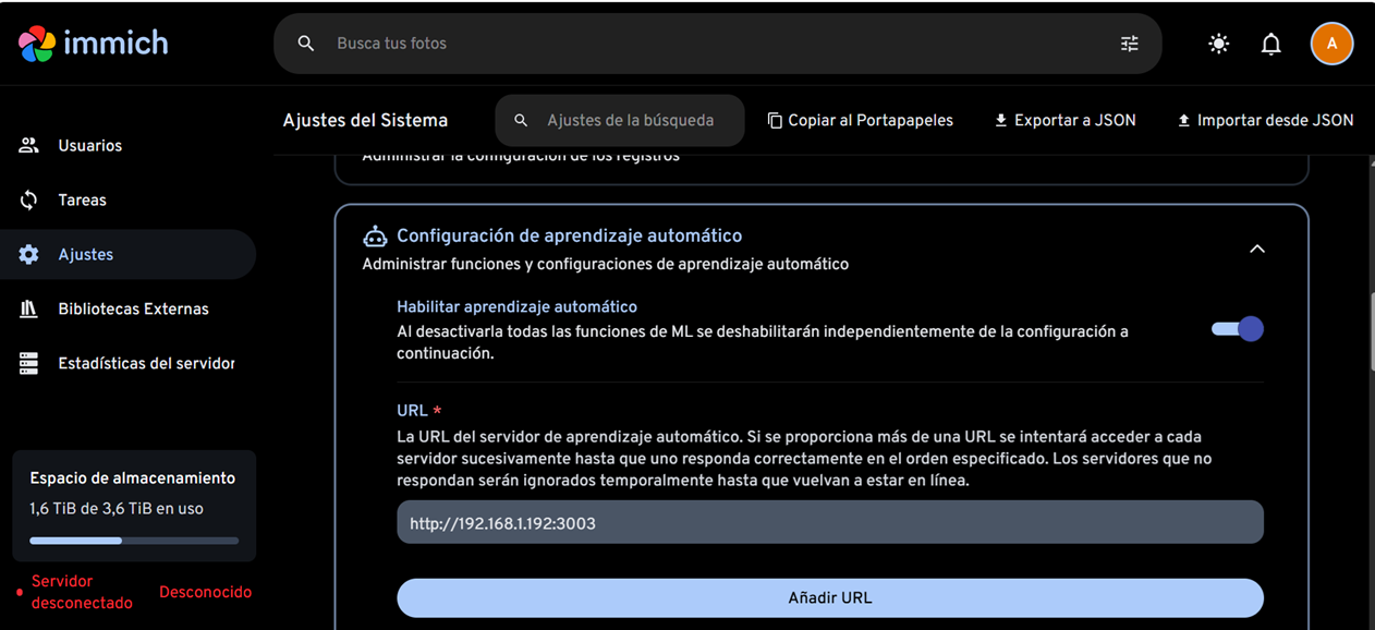 Antes de configurar la biblioteca externa es conveniente decirle a immich que el portátil será el que procese las caras para ello hay que ir a la parte de administración haciendo clic en nuestro nombre/avatar de arriba a la derecha, administración y en Ajustes buscamos Configuración de aprendizaje automático y en la URL indicamos la url de nuestro portátil http://192.168.1.192:3003